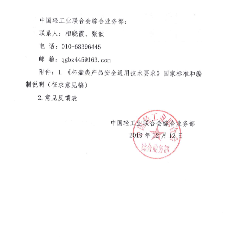 核心提示:中國輕工業聯合會關于征求《杯壺類產品安全通用技術要求》國家標準(征求意見稿)意見的函(中輕聯綜合發〔2019〕405號)。