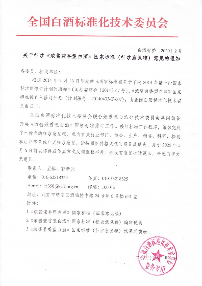 全國白酒標準化技術委員會關于征求《濃醬兼香型白酒》國家標準(征求意見稿)意見的通知(白酒標委〔2020〕2號)