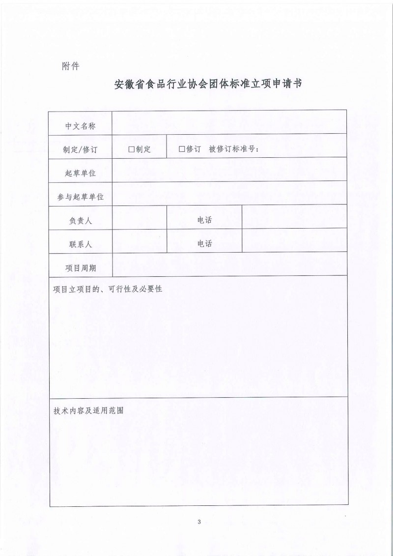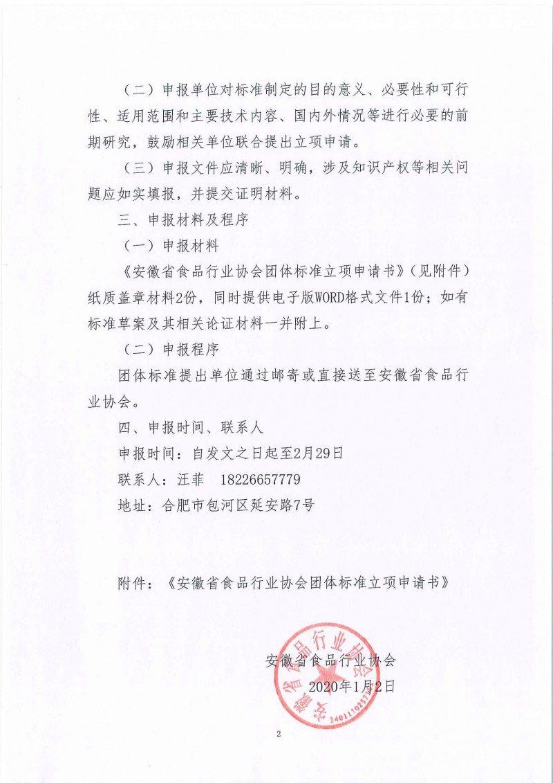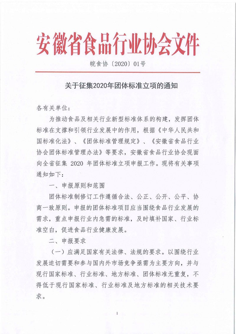 安徽省食品行業(yè)協(xié)會(huì)關(guān)于征集2020年團(tuán)體標(biāo)準(zhǔn)立項(xiàng)的通知(皖食協(xié)〔2020〕01號(hào))