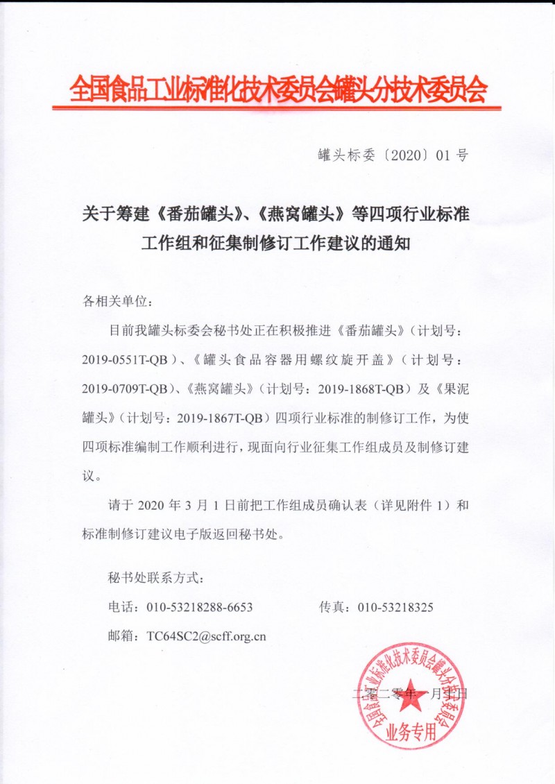 全國食品工業(yè)標(biāo)準(zhǔn)化技術(shù)委員會關(guān)于籌建《番茄罐頭》、《燕窩罐頭》等四項(xiàng)行業(yè)標(biāo)準(zhǔn)工作組和征集制修訂工作建議的通知(罐頭標(biāo)委〔2020〕01號)