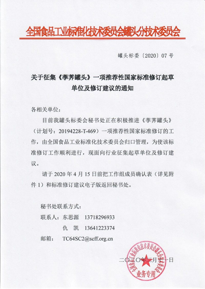 全國食品工業標準化技術委員會關于征集《荸薺罐頭》一項推薦性國家標準修訂起草單位及修訂建議的通知(罐頭標委〔2020〕07號)
