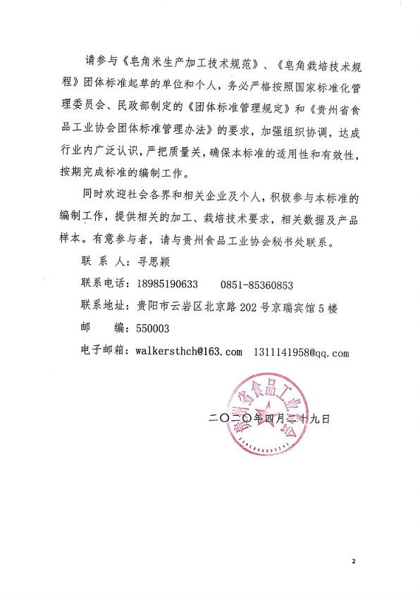 貴州省食品工業協會關于同意 《皂角米生產加工技術規范》、《皂角栽培技術規程》團體標準立項的公告(黔食協[2020]7號)