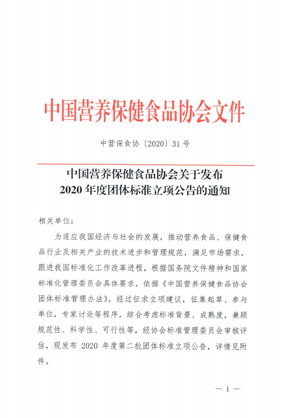 中國(guó)營(yíng)養(yǎng)保健食品協(xié)會(huì)關(guān)于發(fā)布2020年度團(tuán)體標(biāo)準(zhǔn)《乳及乳制品中牛、羊、山羊和綿羊: 性成分定性檢測(cè)方法 (實(shí)時(shí)熒光PCR法和電泳法)》立項(xiàng)公告的通知(中營(yíng)保食協(xié)(2020) 31號(hào))