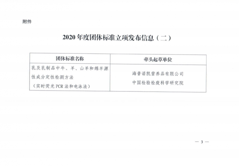 下載中心首頁(yè) » 動(dòng)態(tài)公告 » 標(biāo)準(zhǔn)動(dòng)態(tài) » 中國(guó)營(yíng)養(yǎng)保健食品協(xié)會(huì)關(guān)于發(fā)布2020年度團(tuán)體標(biāo)準(zhǔn)《乳及乳制品中牛、羊、山羊和綿羊: 性成分定性檢測(cè)方法 (實(shí)時(shí)熒光PCR法和電泳法)》立項(xiàng)公告的通知(中營(yíng)保食協(xié)(2020) 31號(hào))