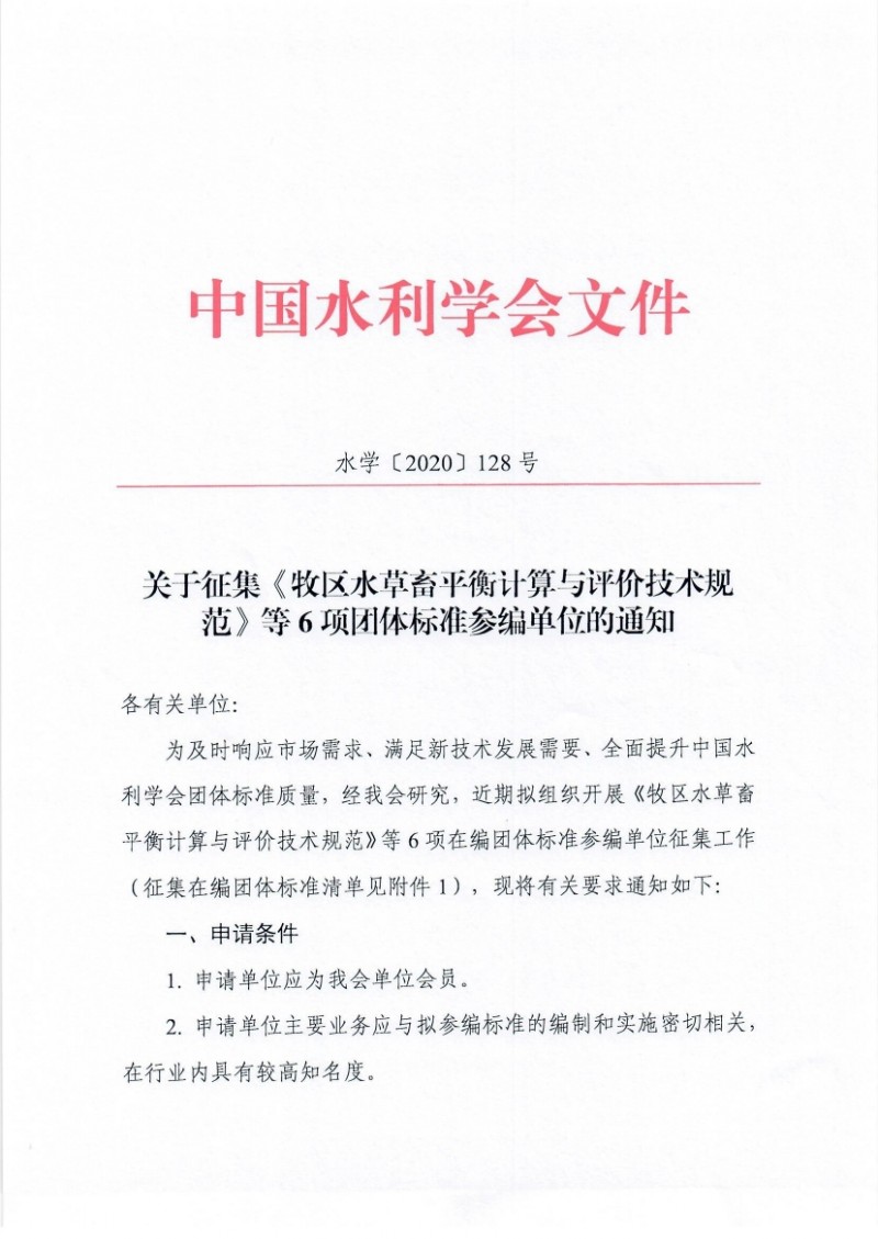 中國水利學會關于征集《牧區水草畜平衡計算與評價技術規范》等6項團體標準參編單位的通知(水學〔2020〕128 號)