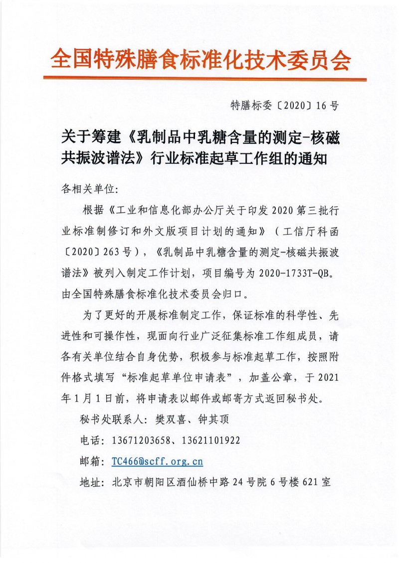 全國(guó)特殊膳食標(biāo)準(zhǔn)化技術(shù)委員會(huì)關(guān)于籌建《乳制品中乳糖含量的測(cè)定--核磁共振波譜法》行業(yè)標(biāo)準(zhǔn)起草工作組的通知(特膳標(biāo)委〔2020〕16號(hào))