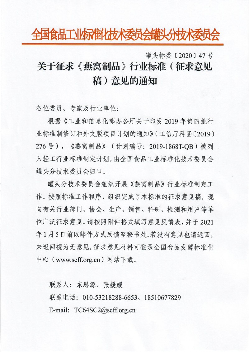 全國食品工業標準化技術委員會罐頭分技術委員會關于征求《燕窩制品》行業標準(征求意見稿)意見的通知(罐頭標委〔2020〕47號)