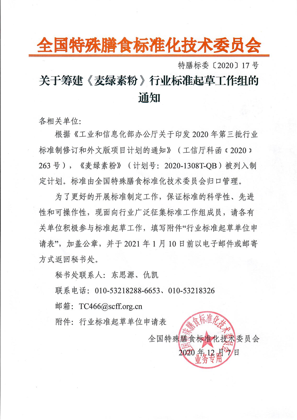 全國(guó)特殊膳食標(biāo)準(zhǔn)化技術(shù)委員會(huì)關(guān)于籌建《麥綠素粉》行業(yè)標(biāo)準(zhǔn)起草工作組的通知(特膳標(biāo)委〔2020〕17號(hào))