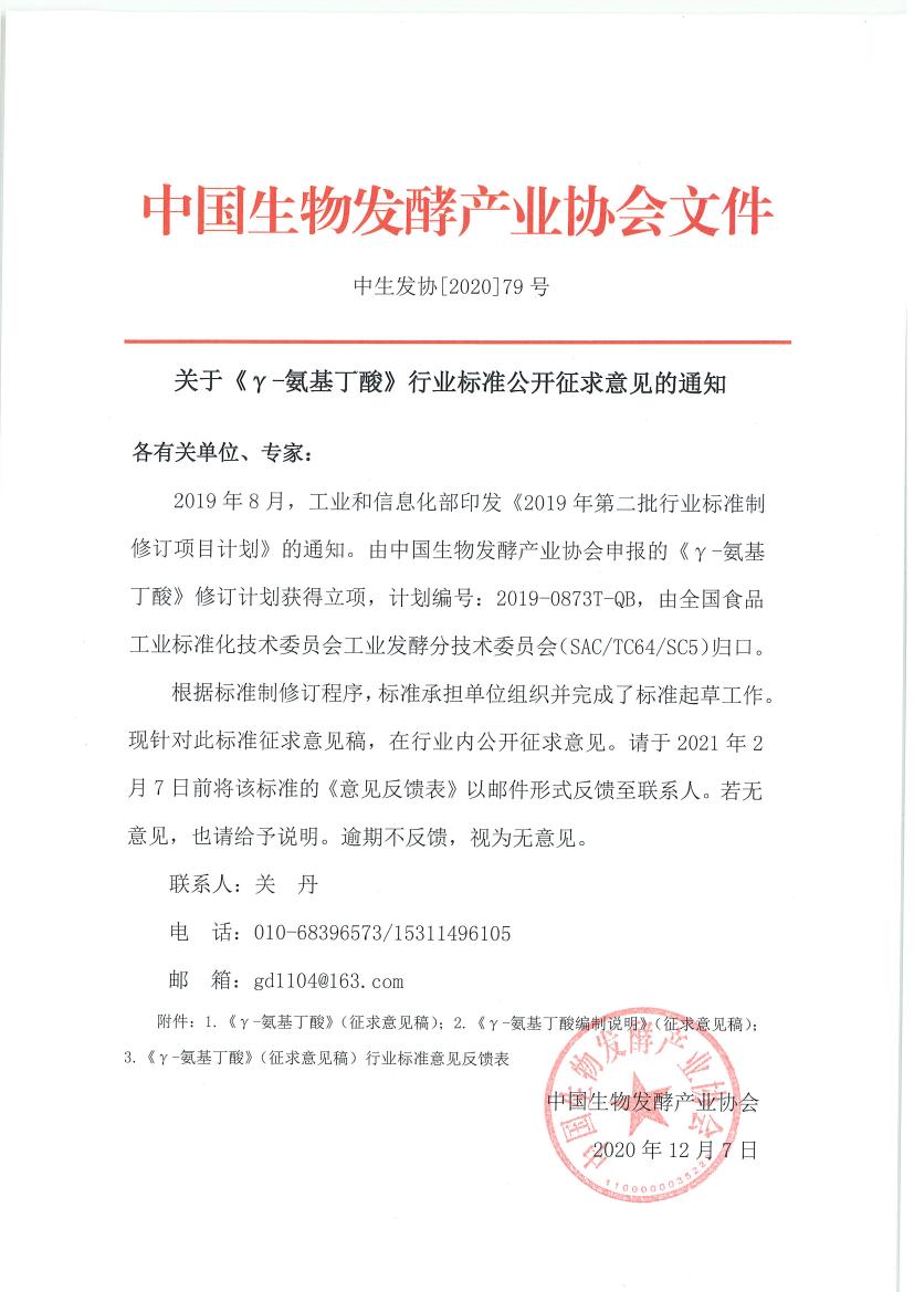 中國生物發酵產業協會關于《γ-氨基丁酸》行業標準公開征求意見的通知(中生發協[2020]79號)