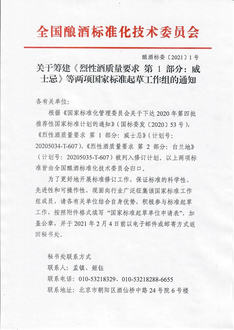 全國釀酒標準化技術委員會關于籌建《烈性酒質量要求 第 1 部分:威士忌》等兩項國家標準起草工作組的通知(釀酒標委〔2021〕1號)