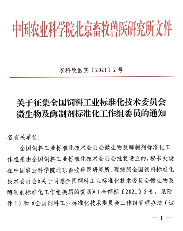 附件1:關于同意全國飼料工業(yè)標準化技術委員會微生物及酶制劑標準化工作組換屆的復函(全飼標〔2021〕5號).pdf