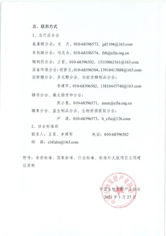 中國生物發酵產業協會關于征集2021年國家標準、行業標準和標準外文版項目立項建議的通知(中生發協標[2021]1號)
