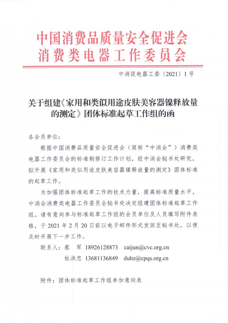 中國消費品質量安全促進會關于組建《家用和類似用途皮膚美容器鎳釋放量的測定》團體標準起草工作組的函(中消促電器工委〔2021)1號)