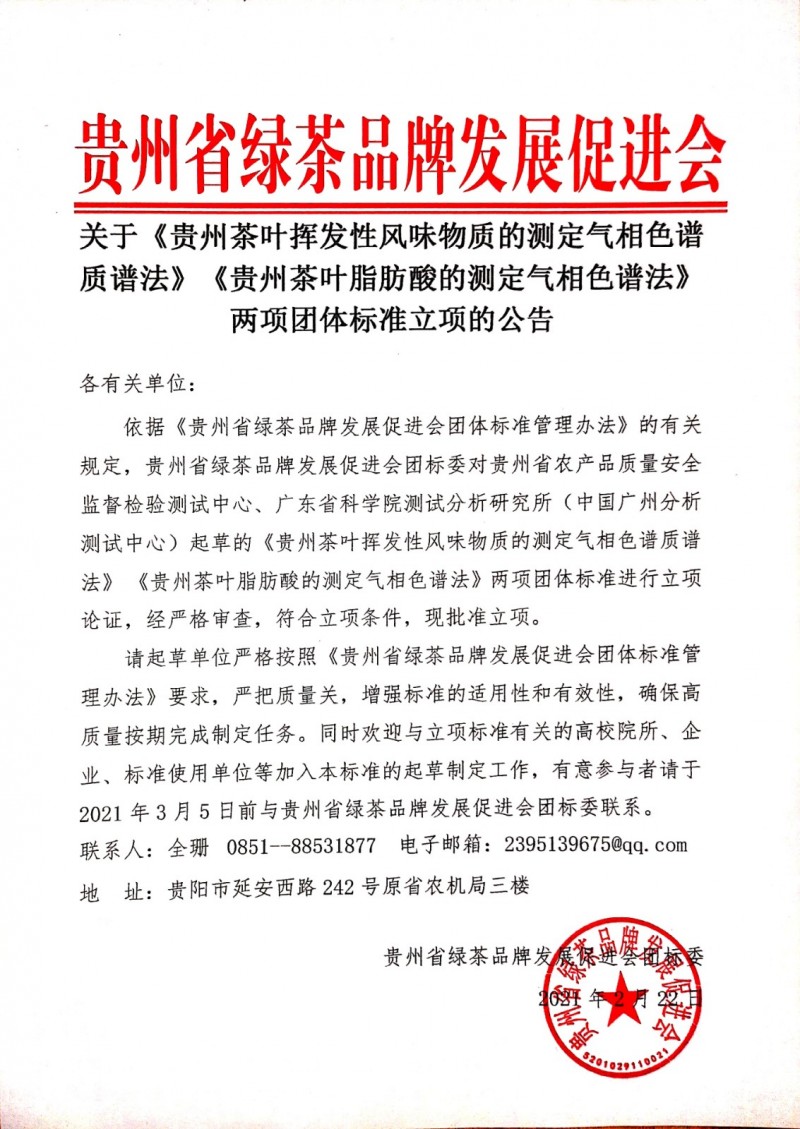 依據《貴州省綠茶品牌發展促進會團體標準管理辦法》的有關規定,貴州省綠茶品牌發展促進會團標委對貴州省農產品質量安全監督檢驗測試中心、廣東省科學院測試分析研究所(中國廣州分析測試中心)起草的《貴州茶葉揮發性風味物質的測定氣相色譜質譜法》 《貴州茶葉脂肪酸的測定氣相色譜法》兩項團體標準進行立項論證,經嚴格審查,符合立項條件,現批準立項。