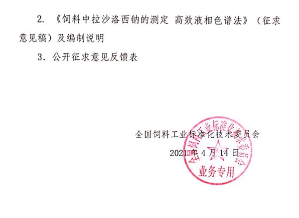 核心提示:全國飼料工業標準化技術委員會關于征求《飼料中酸性洗滌纖維的測定》《飼料中拉沙洛西鈉的測定 高效液相色譜法》2項農業行業標準(征求意見稿)意見的通知(全飼標[2021]32號)。