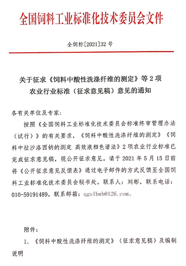 下載中心首頁 » 動態公告 » 標準動態 » 全國飼料工業標準化技術委員會關于征求《飼料中酸性洗滌纖維的測定》等2項農業行業標準(征求意見稿)意見的通知(全飼標[2021]32號)