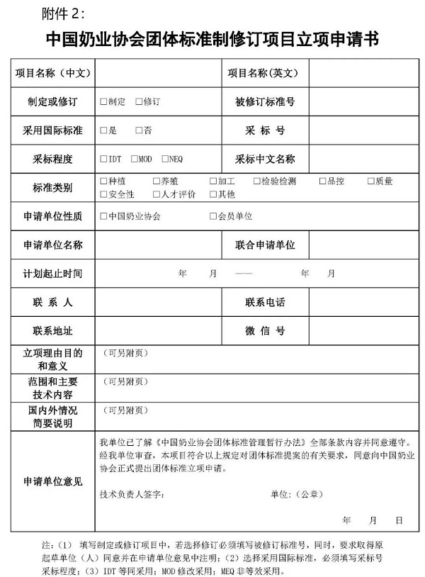 (二)提出立項申請的單位須于2021年5月8日前填寫并報送《團體標準制修訂項目立項申請書》(見附件2)和2~3名專家推薦書至中國奶業協會團體標準管理辦公室。