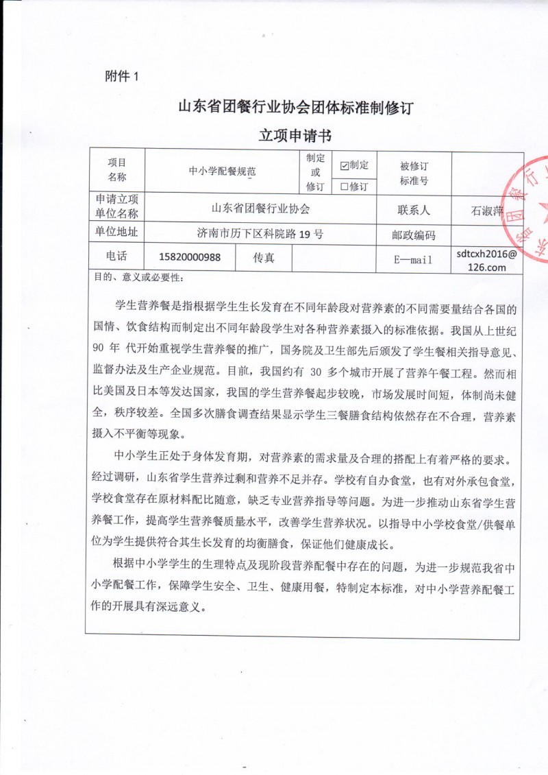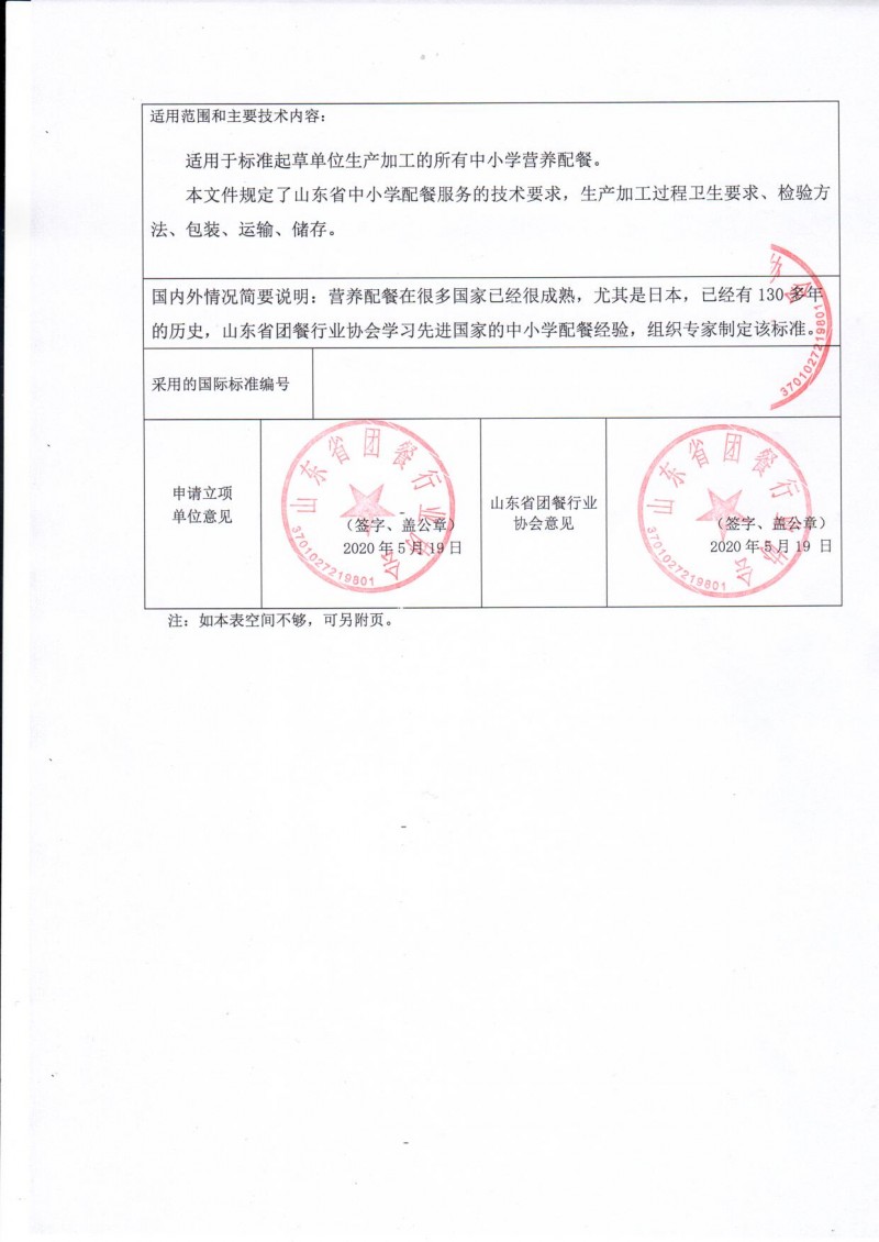 山東省團餐行業協會團體標準制修訂立項申請書