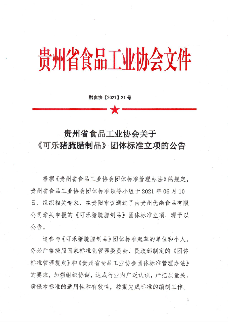 根據(jù)《貴州省食品工業(yè)協(xié)會(huì)團(tuán)體標(biāo)準(zhǔn)管理辦法》的規(guī)定,貴州省食品工業(yè)協(xié)會(huì)團(tuán)體標(biāo)準(zhǔn)領(lǐng)導(dǎo)小組于2021年06月10日,組織相關(guān)專家,在貴陽審議通過了由貴州優(yōu)幽食品有限公司牽頭申報(bào)的《可樂豬腌臘制品》團(tuán)體標(biāo)準(zhǔn)立項(xiàng),現(xiàn)予以公告。