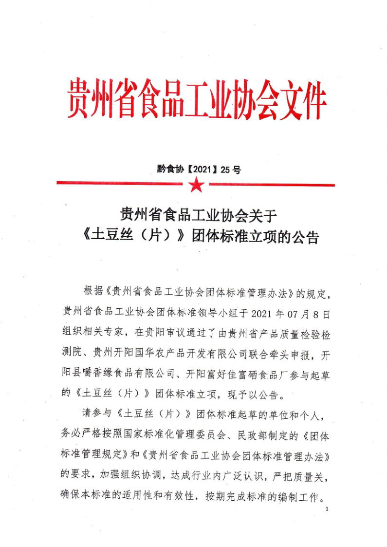 根據(jù)《貴州省食品工業(yè)協(xié)會團體標準管理辦法》的規(guī)定,貴州省食品工業(yè)協(xié)會團體標準領(lǐng)導小組于2021年07月8日組織相關(guān)專家,在貴陽審議通過了由貴州省產(chǎn)品質(zhì)量檢驗檢測院、貴州開陽國華農(nóng)產(chǎn)品開發(fā)有限公司聯(lián)合牽頭申報,開陽縣嚼香緣食品有限公司、開陽富好佳富硒食品廠參與起草的《土豆絲(片)》團體標準立項,現(xiàn)予以公告。