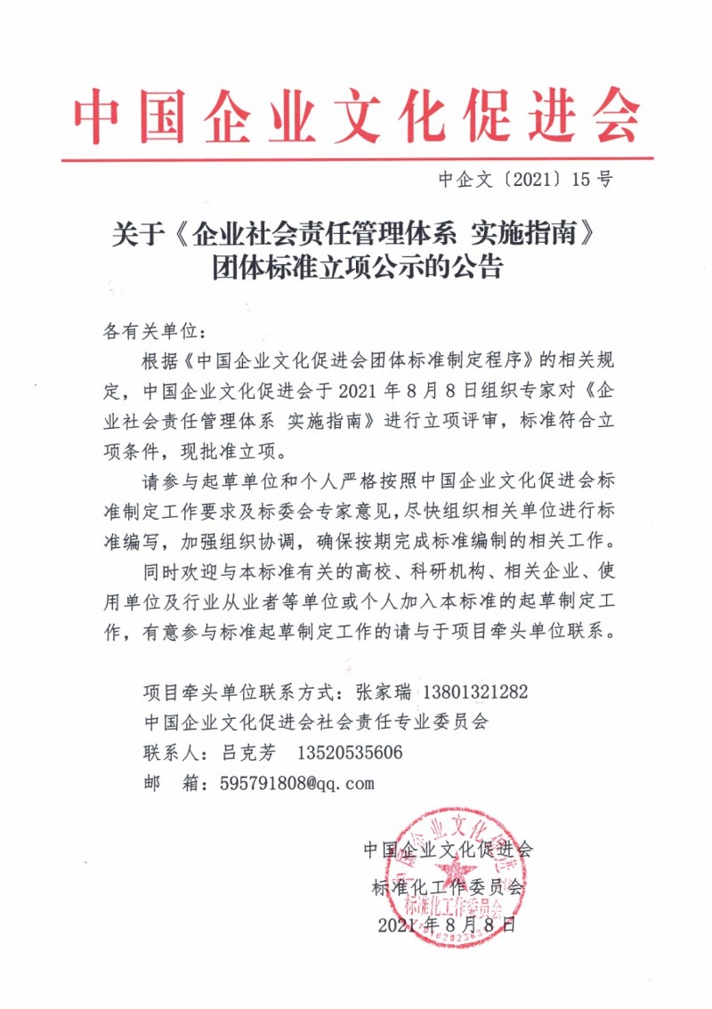 根據《中國企業文化促進會團體標準制定程序》的相關規定,中國企業文化促進會于2021年8月8日組織專家對《企業社會責任管理體系 實施指南》進行立項評審,標準符合立項條件,現批準立項。