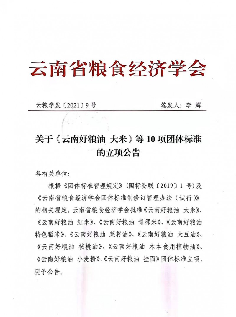 云南省糧食經濟學會下發《關于<云南好糧油 大米>等10項團體標準的立項公告》(云糧學發[2021]9號)