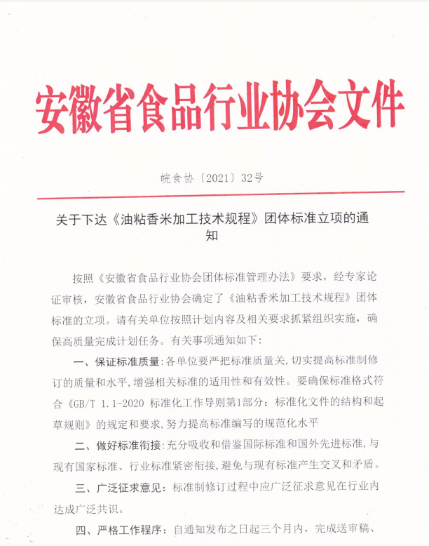 核心提示:安徽省食品行業協會關于下達《油粘香米加工技術規程》團體標準立項的通知(皖食協〔2021〕32號)。