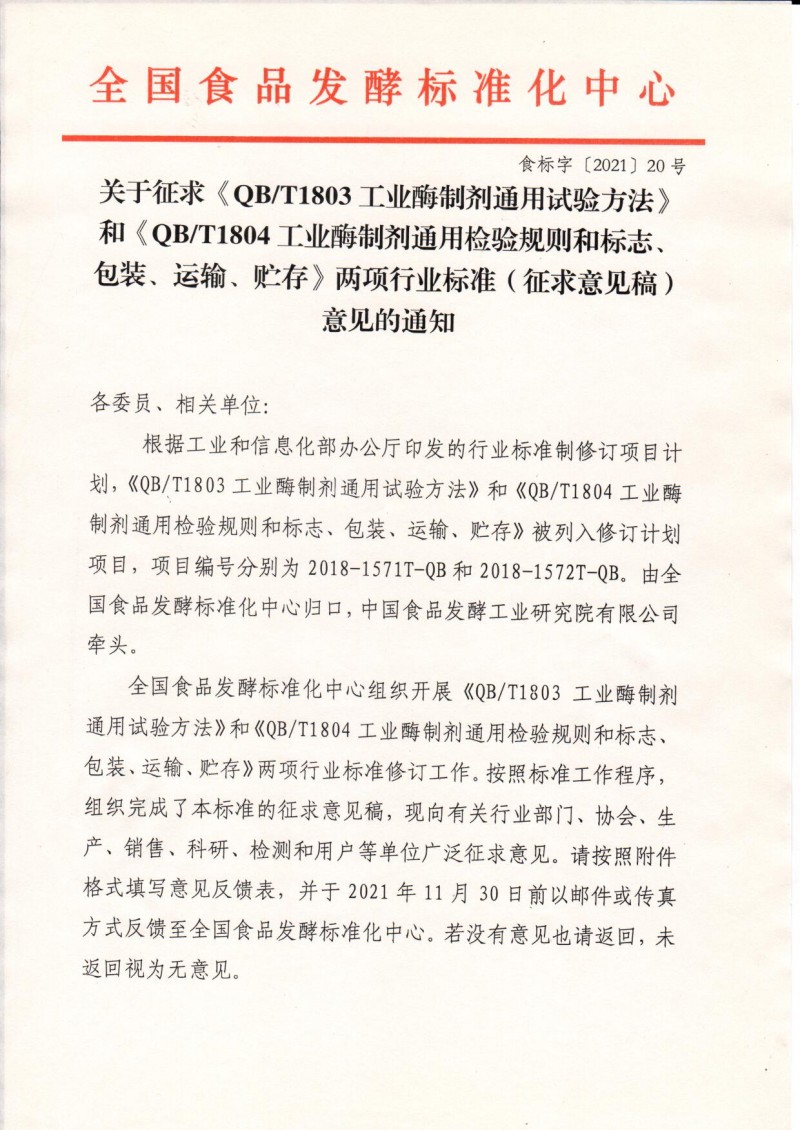 全國食品發酵標準化中心關于征求《QB/T1803 工業酶制劑通用試驗方法》和《QB/T1804 工業酶制劑通用檢驗規則和標志、包裝、運輸、貯存》兩項行業標準(征求意見稿)意見的通知(食標字〔2021〕