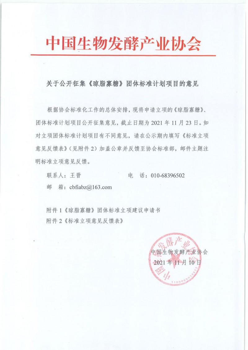 中國生物發酵產業協會關于公開征集《瓊脂寡糖》團體標準計劃項目的意見