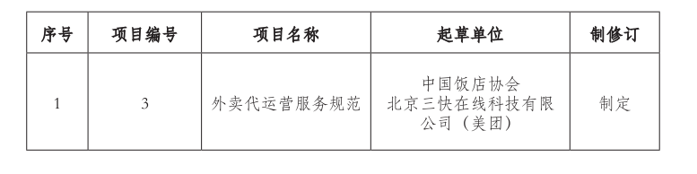 依據(jù)《中國(guó)飯店協(xié)會(huì)團(tuán)體標(biāo)準(zhǔn)管理辦法》的相關(guān)規(guī)定,組織專家對(duì)團(tuán)體標(biāo)準(zhǔn)《外賣代運(yùn)營(yíng)服務(wù)規(guī)范》進(jìn)行了立項(xiàng)評(píng)審,經(jīng)專家組評(píng)審,該團(tuán)體標(biāo)準(zhǔn)符合立項(xiàng)條件,現(xiàn)批準(zhǔn)立項(xiàng)。具體信息如下: