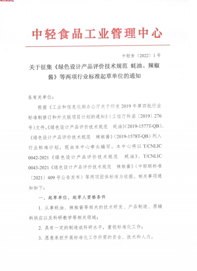 中輕食品工業管理中心關于征集《綠色設計產品 蠔油、辣椒醬》兩項行業標準起草單位的通知(中輕食〔2022〕1號)