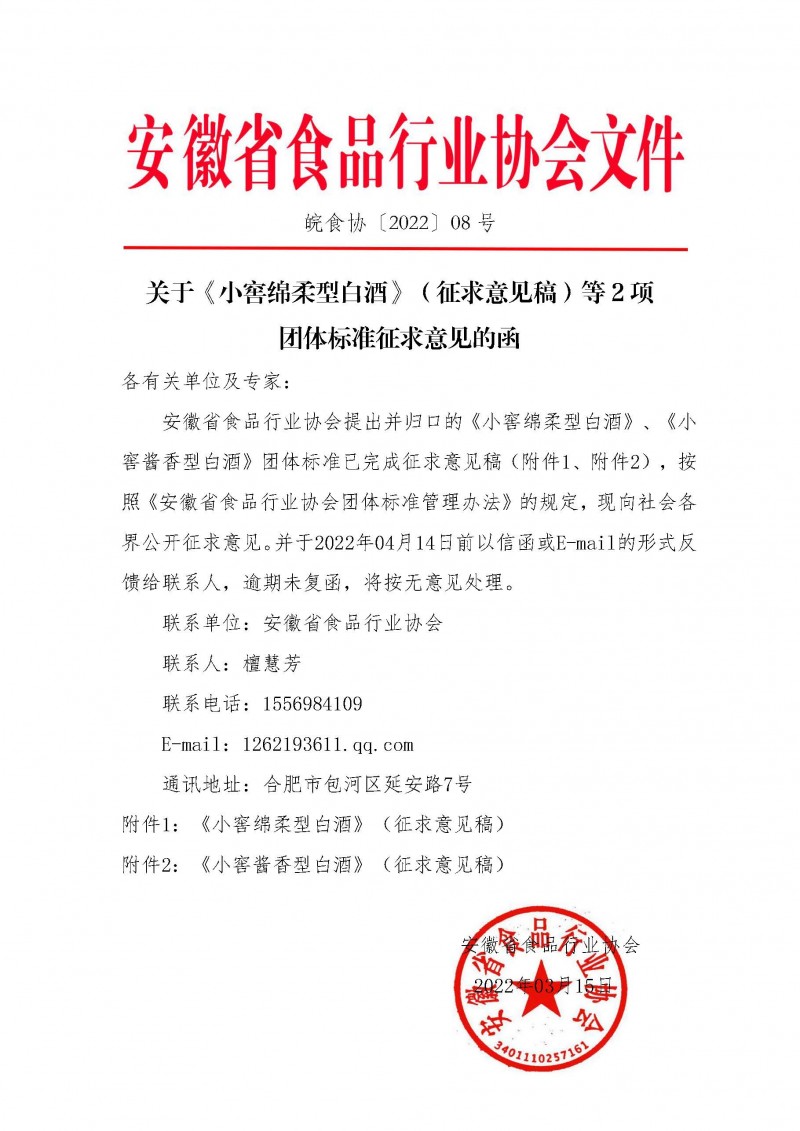 安徽省食品行業協會關于《小窖綿柔型白酒》(征求意見稿)等2項團體標準征求意見的函(皖食協[2022]08號)