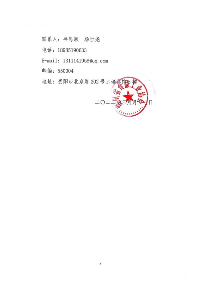 按照貴州省食品工業協會團體標準管理辦法的規定,現向有關行業部門、協會、生產、銷售、科研、檢測和用戶等單位廣泛征求意見。請按照附件格式填寫意見反饋表,并于2022年04月16日前以郵件或傳真方式反饋至秘書處。若沒有意見也請返回,未返回視為無意見。
