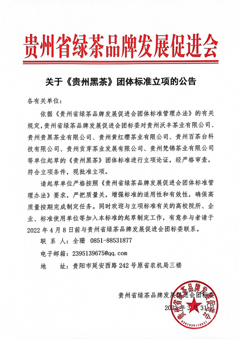 依據(jù)《貴州省綠茶品牌發(fā)展促進(jìn)會(huì)團(tuán)體標(biāo)準(zhǔn)管理辦法》的有關(guān)規(guī)定,貴州省綠茶品牌發(fā)展促進(jìn)會(huì)團(tuán)標(biāo)委對(duì)貴州沃豐茶業(yè)有限公司、貴州貴黑茶業(yè)有限公司、貴州黃紅纓茶業(yè)有限公司、貴州百茶臺(tái)科技有限公司、貴州貢芽茶業(yè)發(fā)展有限公司、貴州梵錦茶業(yè)有限公司等單位起草的《貴州黑茶》團(tuán)體標(biāo)準(zhǔn)進(jìn)行立項(xiàng)論證,經(jīng)嚴(yán)格審查,符合立項(xiàng)條件,現(xiàn)批準(zhǔn)立項(xiàng)。