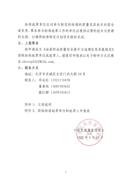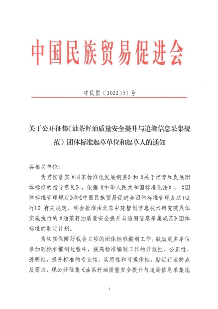 為貫徹落實《國家標準化發展綱要》和《關于培育和發展團體標準的指導意見》,依據《中華人民共和國標準化法》、《團體標準管理規定》和《中國民族貿易促進會團體標準管理辦法(試行)》有關規定,我會批準由北京中建智創信息技術研究院具體實施執行的《油茶籽油質量安全提升與追溯信息采集規范》團體標準的制定計劃。