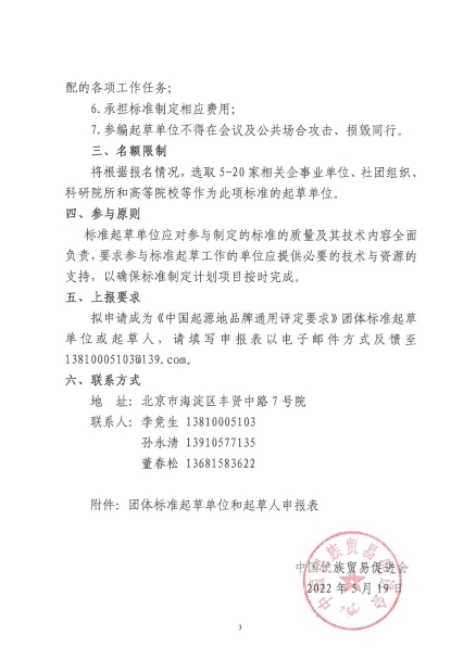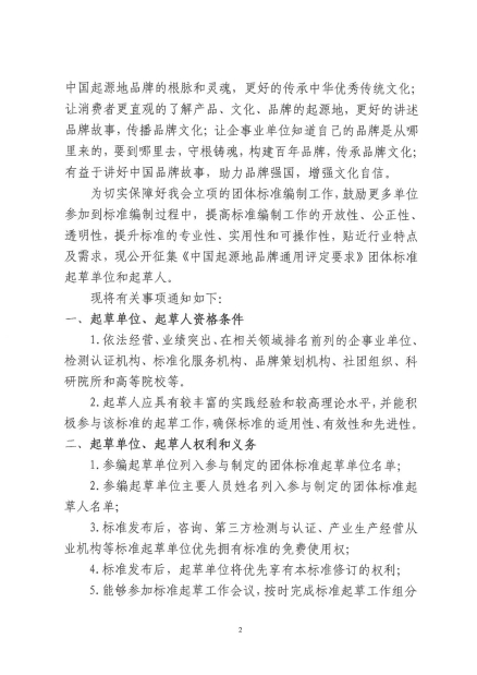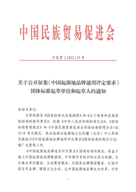 為貫徹落實《國家標準化發展綱要》和《關于培育和發展團體標準的指導意見》,依據《中華人民共和國標準化法》、《團體標準管理規定》和《中國民族貿易促進會團體標準管理辦法(試行)》有關規定,我會批準由起源地文化傳播(北京)中心具體實施執行《中國起源地品牌通用評定要求》團體標準的制定計劃、推廣運營等工作。