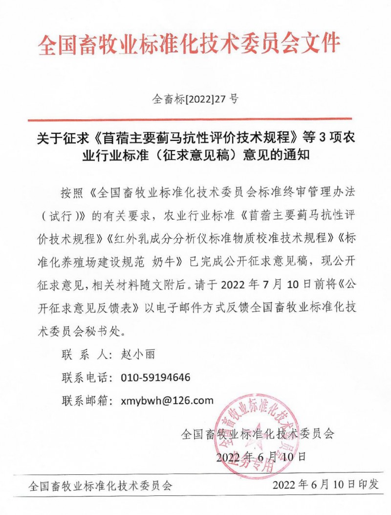 核心提示:全國畜牧業標準化技術委員會關于征求《苜蓿主要薊馬抗性評價技術規程》《紅外乳成分分析儀標準物質校準技術規程》《標準化養殖場建設規范 奶牛》等3項農業行業標準(征求意見稿)意見的通知。于2022年7月10日前反饋。