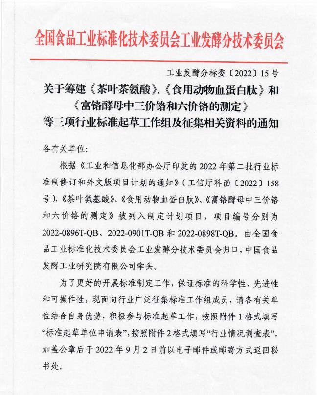 全國食品工業標準化技術委員會工業發酵分技術委員會關于籌建《茶葉茶氨酸》、《食用動物血蛋白肽》和《富鉻酵母中三價鉻和六價鉻的測定》等三項行業標準起草工作組及征集相關資料的通知