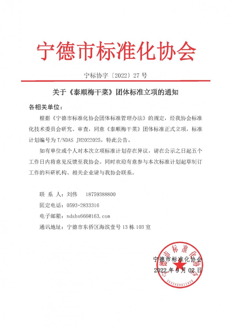 寧德市標準化協會關于《泰順梅干菜》團體標準立項的通知(寧標協字[2022]27號)