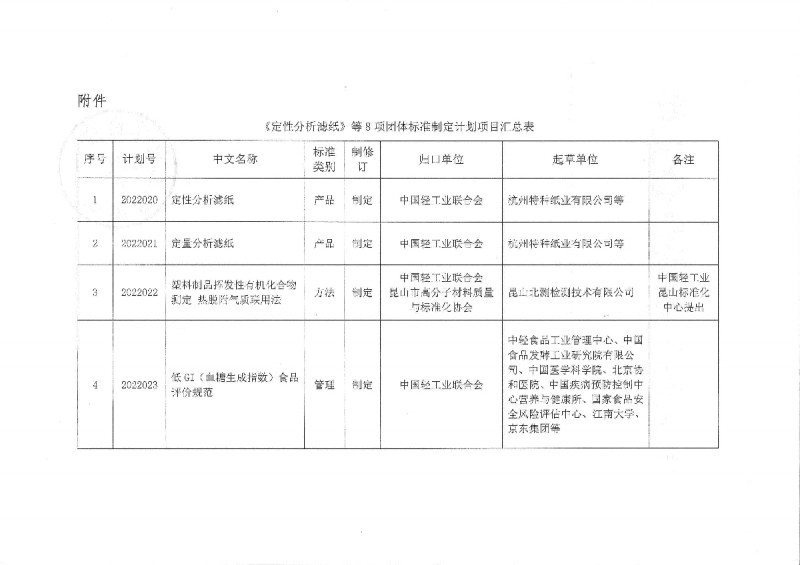 下載中心首頁 » 動態公告 » 標準動態 » 關于下達《定性分析濾紙》等8項中國輕工業聯合會團體標準計劃的通知(中輕聯標準[2022]244號)