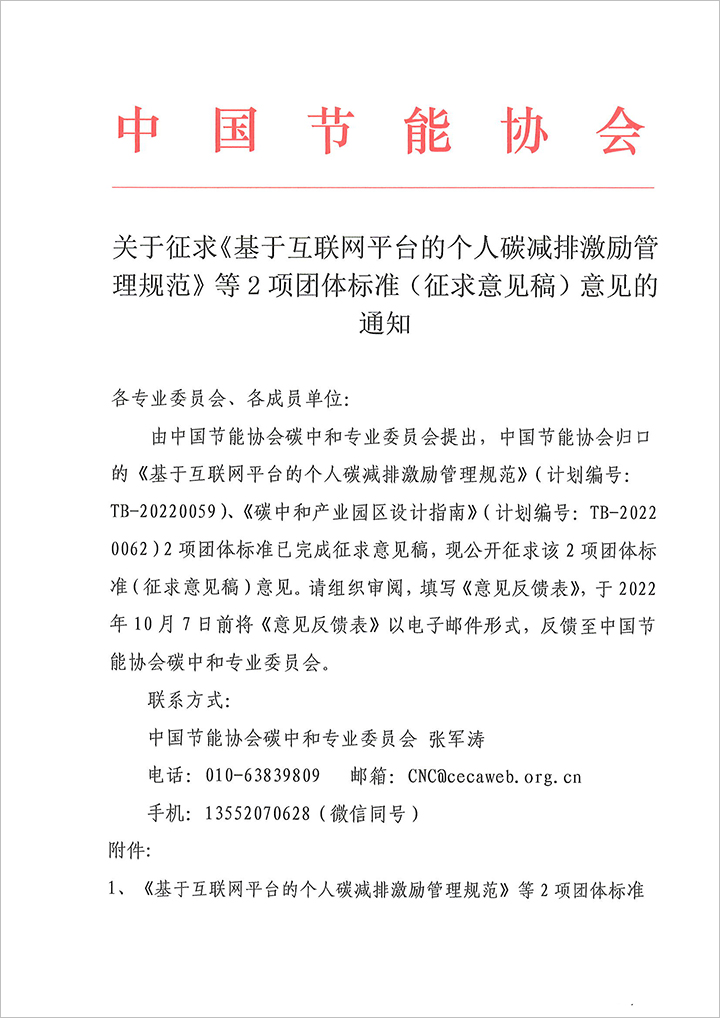 關于征求《基于互聯網平臺的個人碳減排激勵管理規范》等2項團體標準(征求意見稿)意見的通知.PDF
