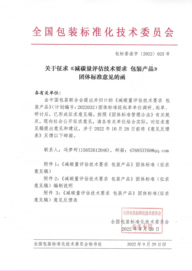 由中國包裝聯合會提出并歸口的《減碳量評估技術要求包裝產品》(計劃編號:2022032)團體標準經起草單位調研、起草、研討后,已形成征求意見稿。現向社會公開征求意見,截止2022年10月28日前。
