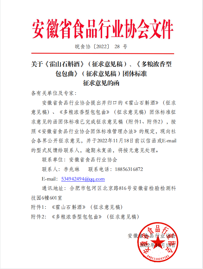 安徽省食品行業協會關于《霍山石斛酒》(征求意見稿)、《多糧濃香型包包曲》(征求意見稿)團體標準 征求意見的函(皖食協[2022]28號)