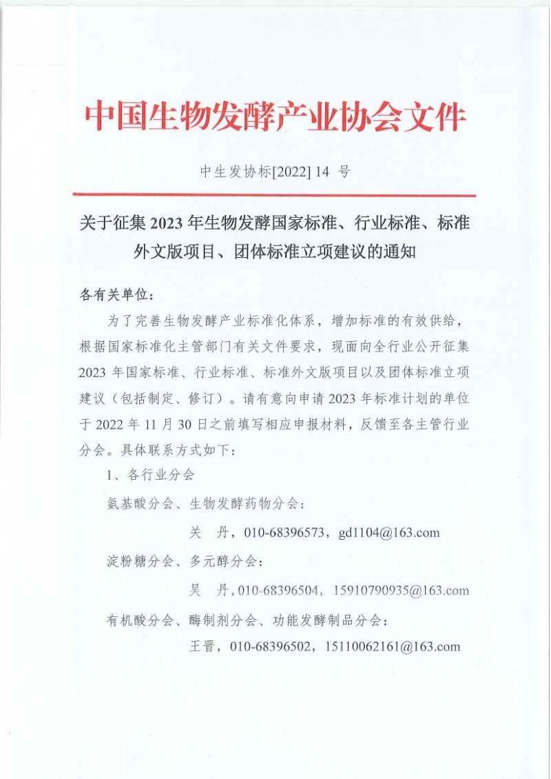 中國生物發酵產業協會關于征集2023年國家標準、行業標準標準、外文版項目、團體標準立項建議的通知