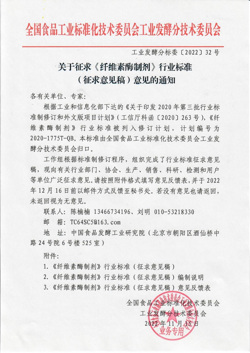 下載中心首頁 » 動態公告 » 標準動態 » 全國食品工業標準化技術委員會工業發酵分技術委員會關于征求《纖維素酶制劑》行業標準(征求意見稿)意見的通知