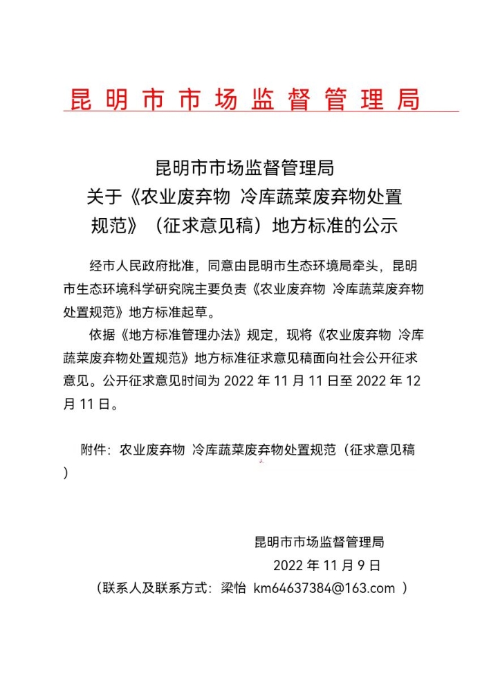 昆明市市場監(jiān)督管理局關于《農業(yè)廢棄物+冷庫蔬菜廢棄物處置規(guī)范》(征求意見稿)地方標準的公示