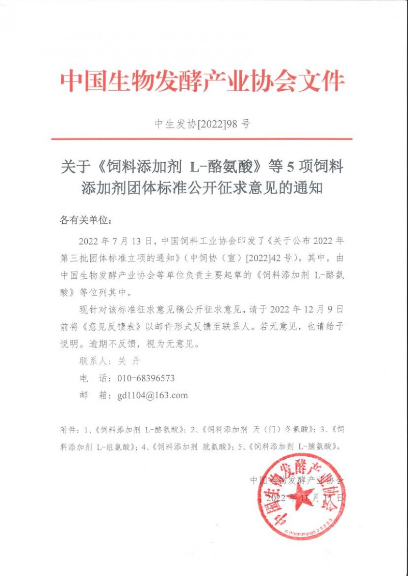 中國(guó)生物發(fā)酵產(chǎn)業(yè)協(xié)會(huì)關(guān)于《飼料添加劑 L-酪氨酸》等5項(xiàng)飼料添加劑團(tuán)體標(biāo)準(zhǔn)公開征求意見的通知(中生發(fā)協(xié)[2022]98號(hào))