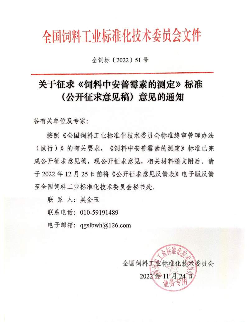 全國飼料工業標準化技術委員會關于征求《飼料中安普霉素的測定》標準(公開征求意見稿)意見的通知