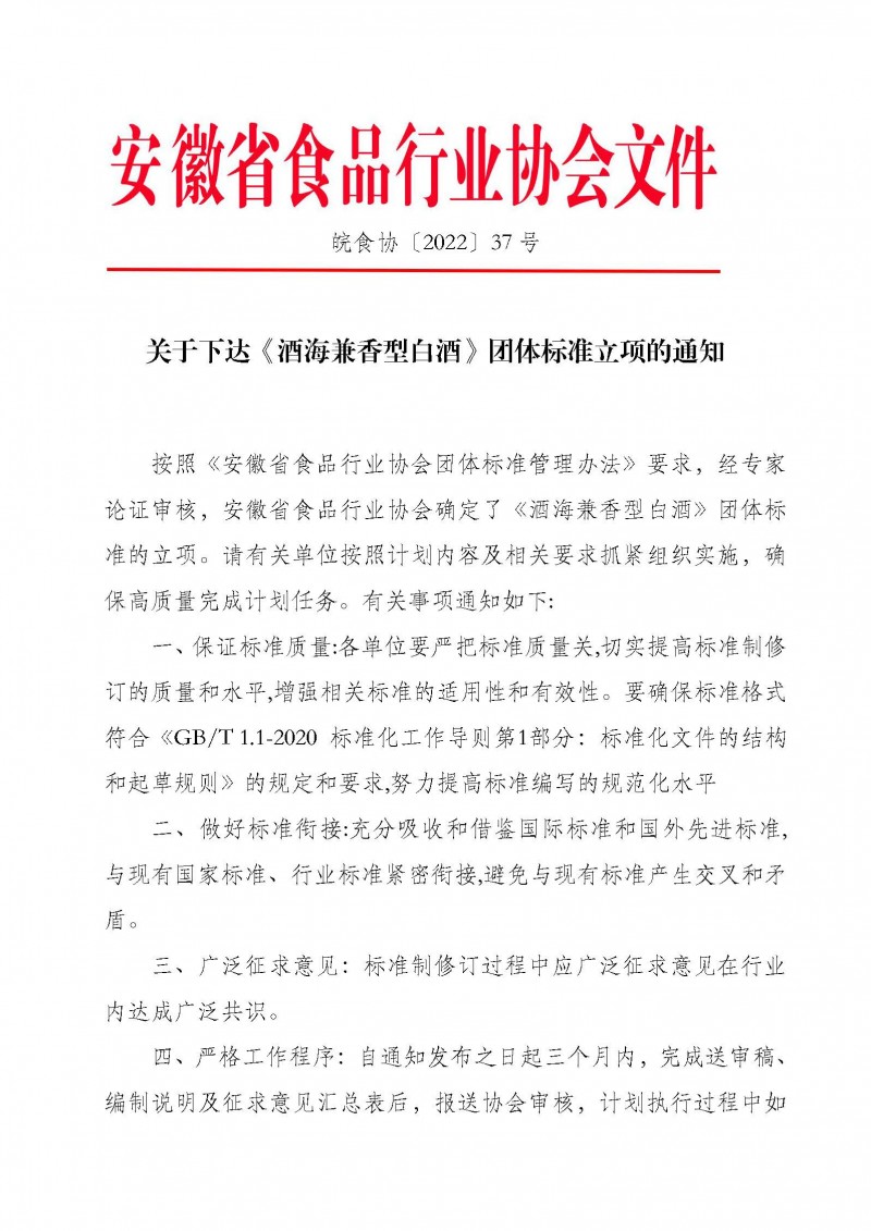 安徽省食品行業協會關于下達《酒海兼香型白酒》團體標準立項的通知(皖食協[2022]37號)