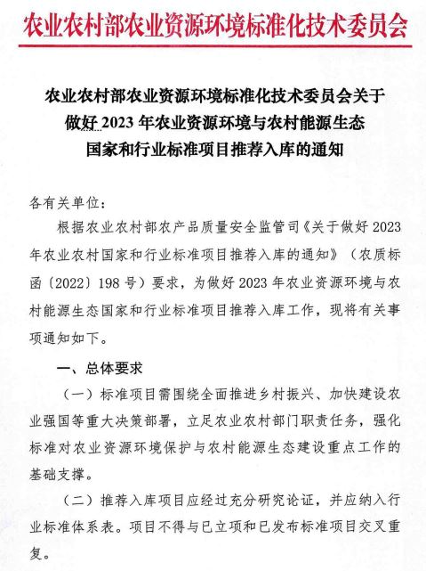 核心提示:農業農村部資源環境標委會關于征集2023年標準項目的通知